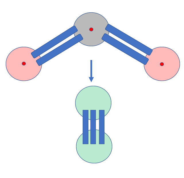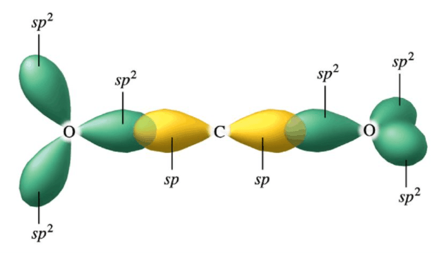 Aus den vier sp3 Hybrid Orbitalen a sechs Elektronen beim Sauerstoff werden jetzt drei sp2 Hybrid Orbitale und jedes enthält zwei Elektronen mit umgekehrten Spin. Der Kohlenstoff hat nur noch zwei sp Hybrid Orbitale mit jeweils zwei Elektronen besetzt. Und jetzt kommt der Clou. Die sp Hybrid Orbitale des Kohlenstoffs überlagern jeweils mit einem sp2 Hybrid Orbital der Sauerstoffatome. Sauerstoff und Kohlenstoff nutzen also gemeinsam ihre Elektronen, um eine stabile Verbindung einzugehen, man spricht von einer kovalenten Bindung. Wie man leicht am obigen Gebilde erkennen kann, ist das obige Gebilde achsensymmetrisch.