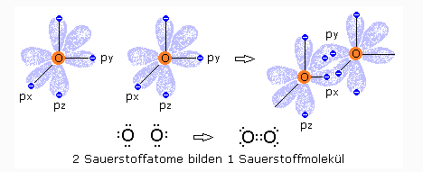 Wir sind aber leider immer noch nicht fertig mit der Elektronenverteilung des Sauerstoffatoms. Denn wie man sicherlich weiß, kommt ein einzelnes Sauerstoffatom ja in der Natur gar nicht vor, man spricht ja immer von O2 also einem Molekül aus zwei Sauerstoffatomen. Bei der Wechselwirkung von Atomen zu benachbarten Atomen “verformen” sich die Aufenthaltsräume der beteiligten Atome zu sogenannten Hybrid (=Zusammensetzung aus Verschiedenartigem) Orbitalen. Durch die “Verformung” der Orbitale kann die Energie der einzelnen Atome im Verbund zu einem Molekül abgesenkt werden und daher ist das Molekül stabiler als die Atome alleine. Das ist immer der Fall, wenn wir von einer exothermen chemischen Reaktion sprechen. Während der Reaktion orientieren sich die beteiligten Atome neu und gehen eine chemische Bindung ein, die zu einem energieärmeren aber stabileren Molekül führt. Die Energie, die durch die Bindung der Atome zum Molekül frei wird, nennt man chemische Bindungsenergie und sie wird eben bereitgestellt durch eine Veränderung der ursprünglichen Aufenthaltsräume der Elektronen um ihren Kern.
