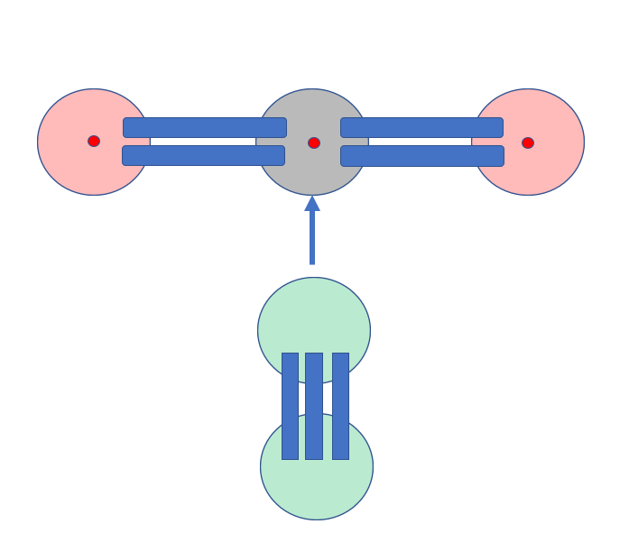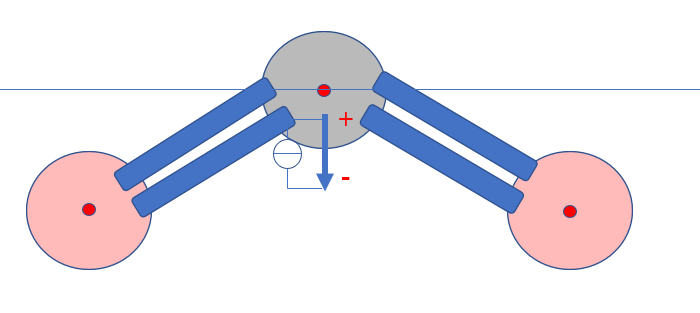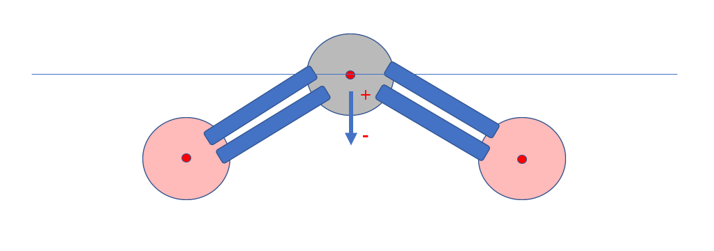 Die zusammenhaltenden Federn werden aber durch die acht Bindungselektronen von Kohlenstoff und Sauerstoff realisiert. Symmetrie Überlegungen führen dazu, dass der Masse- wie Ladungsschwerpunkt im Zentrum des Kohlenstoffatoms sich befindet. Doch das kann sich ganz plötzlich ändern, wenn z.B. ein Stickstoffmolekül dem Kohlenstoffatom im CO2 Molekül einen Kick gibt, etwas so: