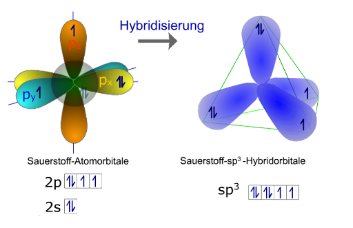 Was heißt das konkret für das Sauerstoff Atom? Bei der Annäherung eines Sauerstoff Atomes mit einem anderen Sauerstoffatom verändern sich das kugel symmetrische 2s Orbital und die drei hantelförmigen 2p Orbitale zu vier keulen-artigen Hybrid Orbitalen, die zusammen ein Tetraeder aufspannen.