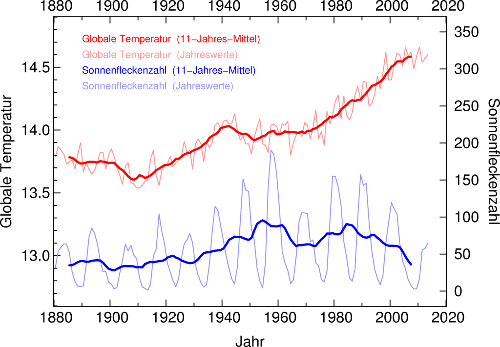 Zunächst stellt sich die Frage, was noch neben des Anwachsen des CO2 Spiegels, die mittlere globale Temperaturerhöhung verursacht haben könnte. Da fällt der Blick natürlich auf die eigentliche Ursache für Wärme in unserem Sonnensystem: “Die Sonne”. Die Sonne strahlt nicht immer gleich stark sondern schwankt in einem Zyklus von elf Jahren (Sonnenfleckenzyklus). Seit den 80ziger Jahren beobachtet man sogar einen längerfristigen Abwärtstrend trotzdem sieht man ein sehr starken Anstieg der globalen mittleren Temperatur. Die Sonne fällt als Erklärung also aus.