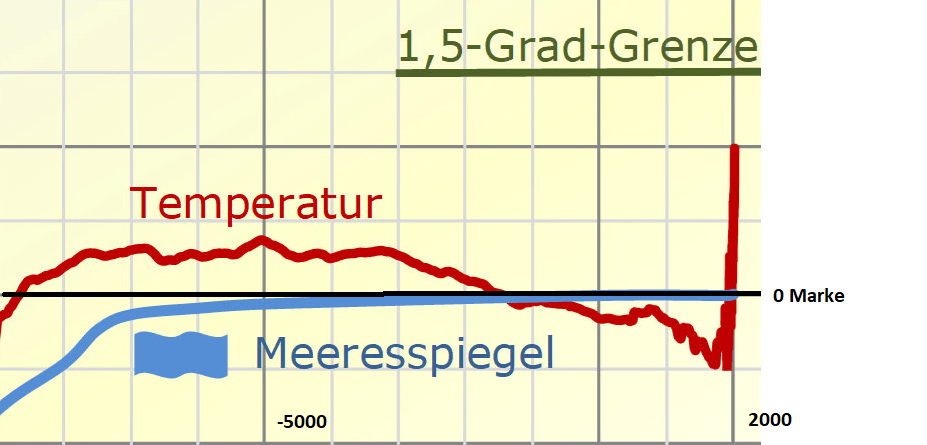 Die obige Temperatur Plot besagt, dass ohne Ausbeutung der fossilen Energieträger (orange Kurve) wir im Holozän geblieben wären. Das sagen übrigens alle Klimamodelle, die wissenschaftlich anerkannt sind. Keins prognostiziert einen mittleren Temperaturanstieg, es sei denn man dreht am Parameter CO2.