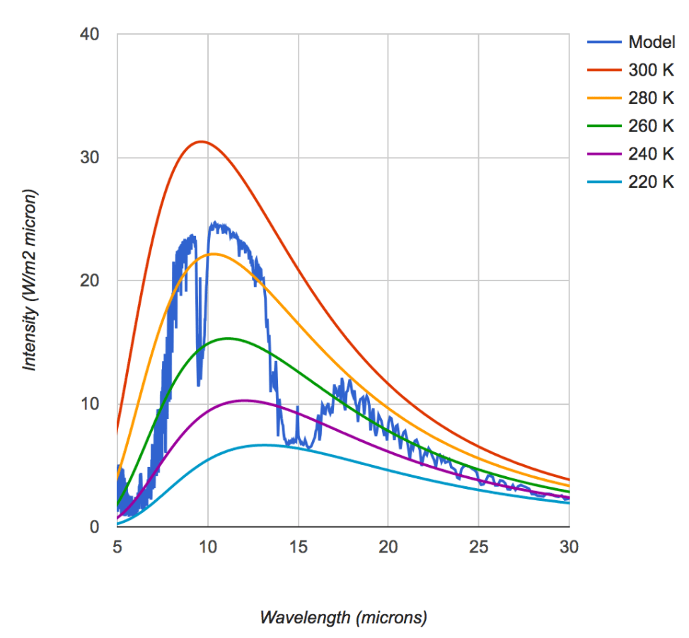Die Kurven geben die spektrale Energieverteilung eines idealisierten “schwarzen” Körpers bei einer bestimmten Temperatur an. Der Begriff “schwarzer” Körper ist immer wieder sehr irritierend. Ein Körper, der im Temperaturgleichgewicht ist, gibt genauso viel Energie ab, wie er aufnimmt. Die Sonne ist z.B. ein fast idealer schwarzer Körper. Die gezackte Linie gibt wiederum die spektrale Energieverteilung unserer Atmosphäre wider, gemessen von Satelliten außerhalb der Atmosphäre. Und es fällt auf, dass im nahen infrarot Bereich Wellenlänge < 10 Mikrometer und um die 15 Mikrometer starke Einbrüche im Spektrum vorliegen zu dem. Das bedeutet, dass diese Spektralanteile in der Atmosphäre zurückgehalten werden. Die Ursache für das Zurückhalten, der Erdstrahlung in diesem Bereich, ist aber nicht nur das Schwingungsverhalten von CO2 sondern auch von Gasen wie Methan und Lachgas aber ganz wesentlich auch von Wasserdampf.