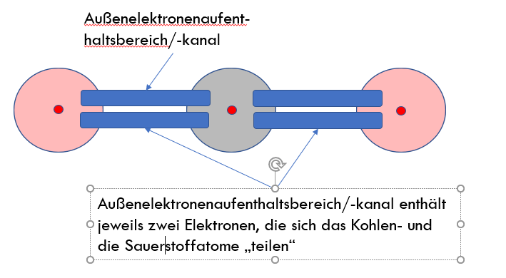 Die Lewis Formel setzt auf ein (Zwiebel-) Schalenmodell bei dem jeweils eine Schale von maximal zwei Elektronen besetzt werden können. Die Außenelektronen Schalen, die nur einfach besetzt sind geben die Bindigkeit (Eignung zur Bindung) an. Bei Sauerstoff liegt die Bindigkeit bei zwei und bei Kohlenstoff bei vier.