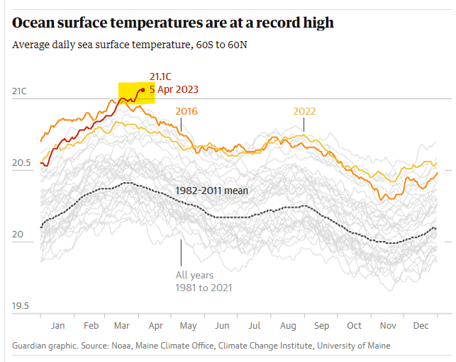 Derzeit wird vielen bewusst, dass auch die Meere sich stark erwärmt haben durch den Menschen gemachten Klimawandel. So findet man auf dem Klima Dashboard der US amerikanischen Behörde für Ozeanografie folgende Temperaturentwicklung: