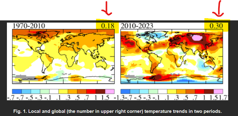 As you can see from the upper chart (base temperature data comes from NASA https://climate.nasa.gov/vital-signs/global-temperature/?intent=121) the slopes of the linear fits for the given time periods are clearly increasing.