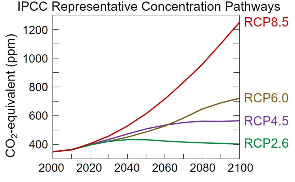 In the modest climate scenario, RCP 2.6, the CO2 concentration would peak between 2040 and 2070 at around 440 ppm (parts per million) and then decrease due to natural CO2 absorption through photosynthesis. However, we are already at a concentration of 425 ppm today (source: NASA).