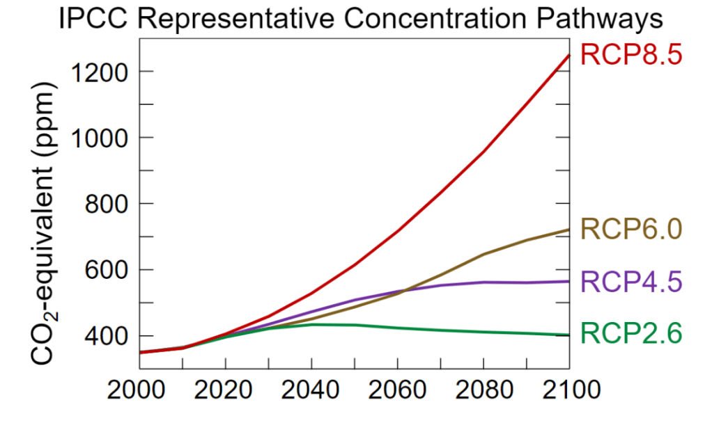 RCP 4.5: A stabilization scenario where emissions peak around 2040 and then decline, aiming for a concentration of around 650 ppm CO2-equivalent by 2100. This scenario assumes intermediate levels of greenhouse gas mitigation.