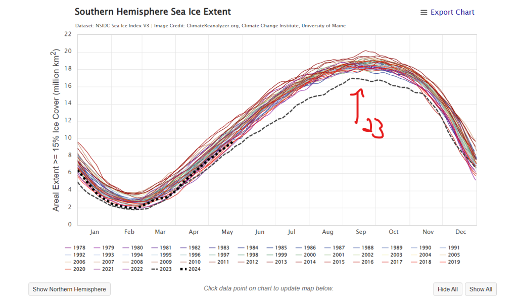 You see for 23 a tremendous loss of ice recovery at the south pol in the winter period of the Southern Hemisphere. As water has a much higher temperature capacity than air, the water temperature won’t get down so easily, and that’s terrible news for the corrals in the seas (https://chrisfaustulus.com/2024/04/17/das-leiden-in-den-meeren/). This will have a tremendous bad impact on the global food chain. Moreover, Corrals are critical for coast protection because they act as natural barriers that reduce wave energy and erosion, thus protecting shorelines from storm surges and coastal degradation. In combination with stronger and stronger getting storms, that is a horrible combination. So I assume that this will be the first tipping point that will fall (and it has been tipping already quite a while). It is not that spectacular, like the interruption of the AMOC (https://chrisfaustulus.com/2024/02/29/the-amoc/) but very effective because this tipping over happens quietly under the sea and the damages on the food chain take time until we really recognize them, and so we will act again too late.
