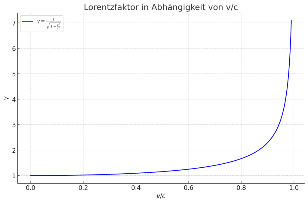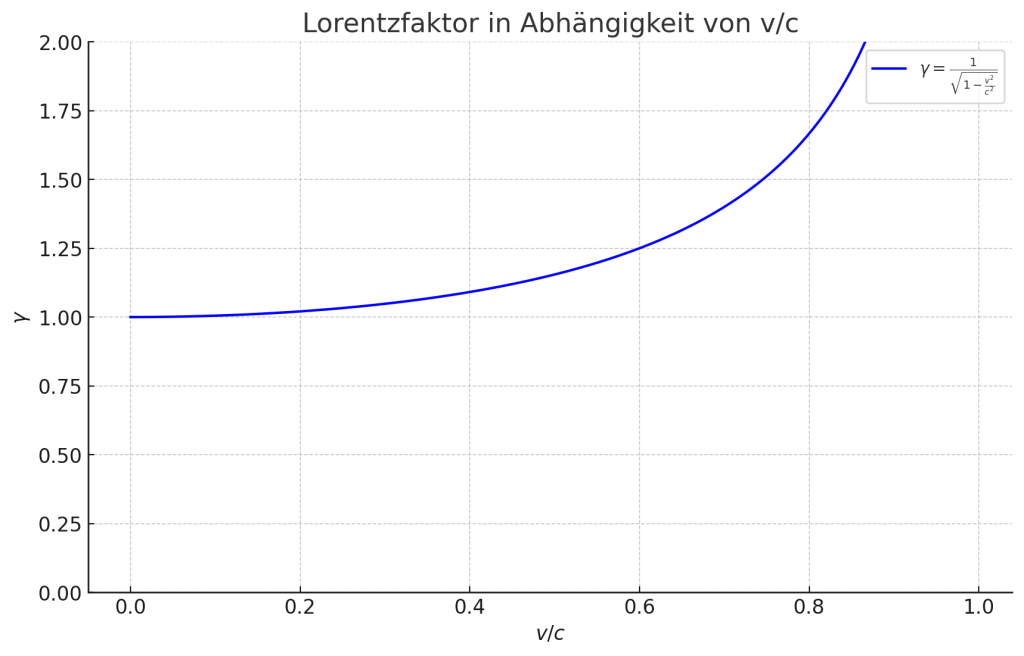 - Der Lorentzfaktor γ: Der Faktor γ beschreibt, wie stark die Zeit gedehnt wird (=langsamer tickt), je schneller sich das Bezugssystem bewegt. Je näher die Geschwindigkeit v der Lichtgeschwindigkeit c kommt, desto größer wird γ und desto stärker ist die Zeitdilatation.