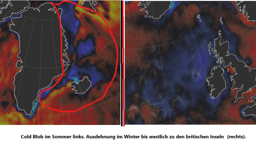 Der deutsche Ozeanograf und Klimaforscher Stefan Rahmstorf hat diesem Gebiet den Namen “Cold Blob” gegeben. Gleichzeitig bildete sich südwestlich von Grönland an der Nordostküste Amerikas und westlich von Südneufundland eine Temperaturzone mit starker positiver Temperaturanomalie, derzeit mit einer Temperaturanomalie von +5 Grad: