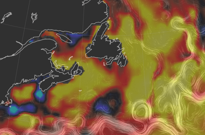 - Wärmeres Wasser entlang der nordamerikanischen Küste: Da das warme Wasser aus den Tropen nicht wie gewohnt nach Norden transportiert wird, sammelt es sich an der Nordostküste Nordamerikas und vor Neufundland. Dadurch entstehen dort ungewöhnlich hohe Oberflächentemperaturen.