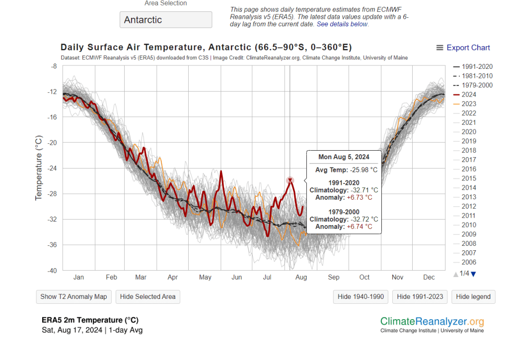 Auch die Antarktis zeigt im August 2024 besorgniserregende Daten:
