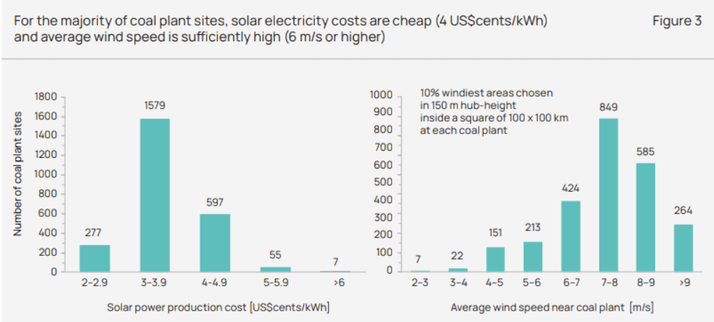 The attached image presents two key pieces of data related to the solar and wind potential at coal plant sites, highlighting why the majority of these sites could transition to renewable energy with competitive costs: