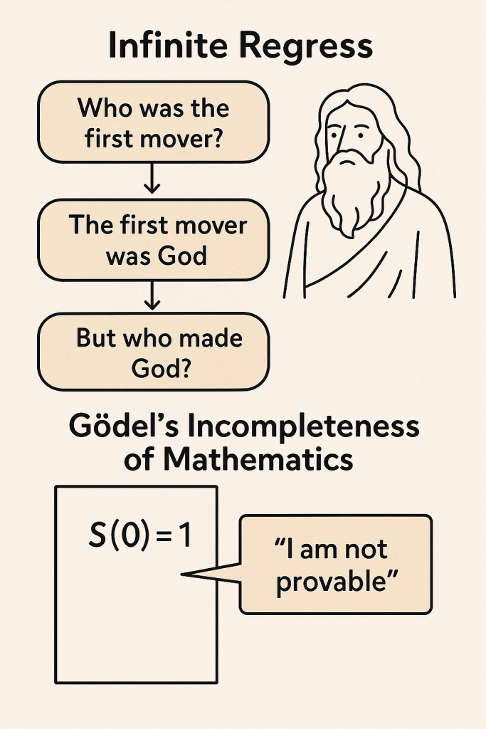 Genau wie die philosophische Frage nach dem Erstbeweger uns zeigt, dass nicht alles erklärbar ist, zeigt uns Gödel, dass auch in der Mathematik nicht alles beweisbar ist. Beide Konzepte weisen darauf hin, dass unser Streben nach ultimativer Erklärung oder Begründung Grenzen hat – Grenzen, die tief in der Struktur unseres Denkens verankert sind.